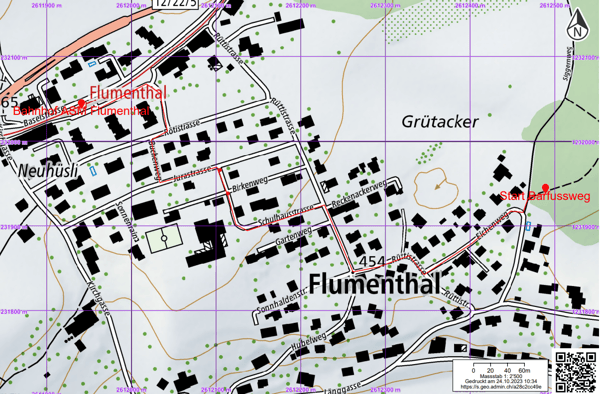 Ab Bahnhof ASM Flumenthal sind es ca. 12 Gehminuten (820 m) bis zum Barfussweg. Der Spaziergang bis zum Barfussweg führt durchs Dorf und ist auch mit Kinderwagen/Rollstuhl/Leiterwagen o.ä. gut